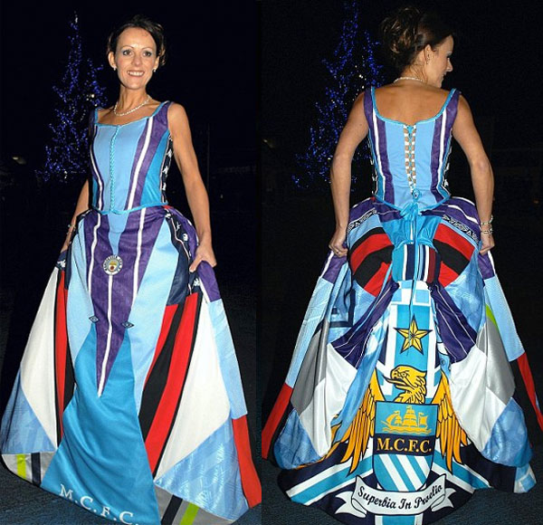 Still, as is often the case with these things, sometimes it’s better to have a go yourself, which is exactly what this daring young lady did when she designed and actually made her own wedding dress from her fiance’s football shirt collection: