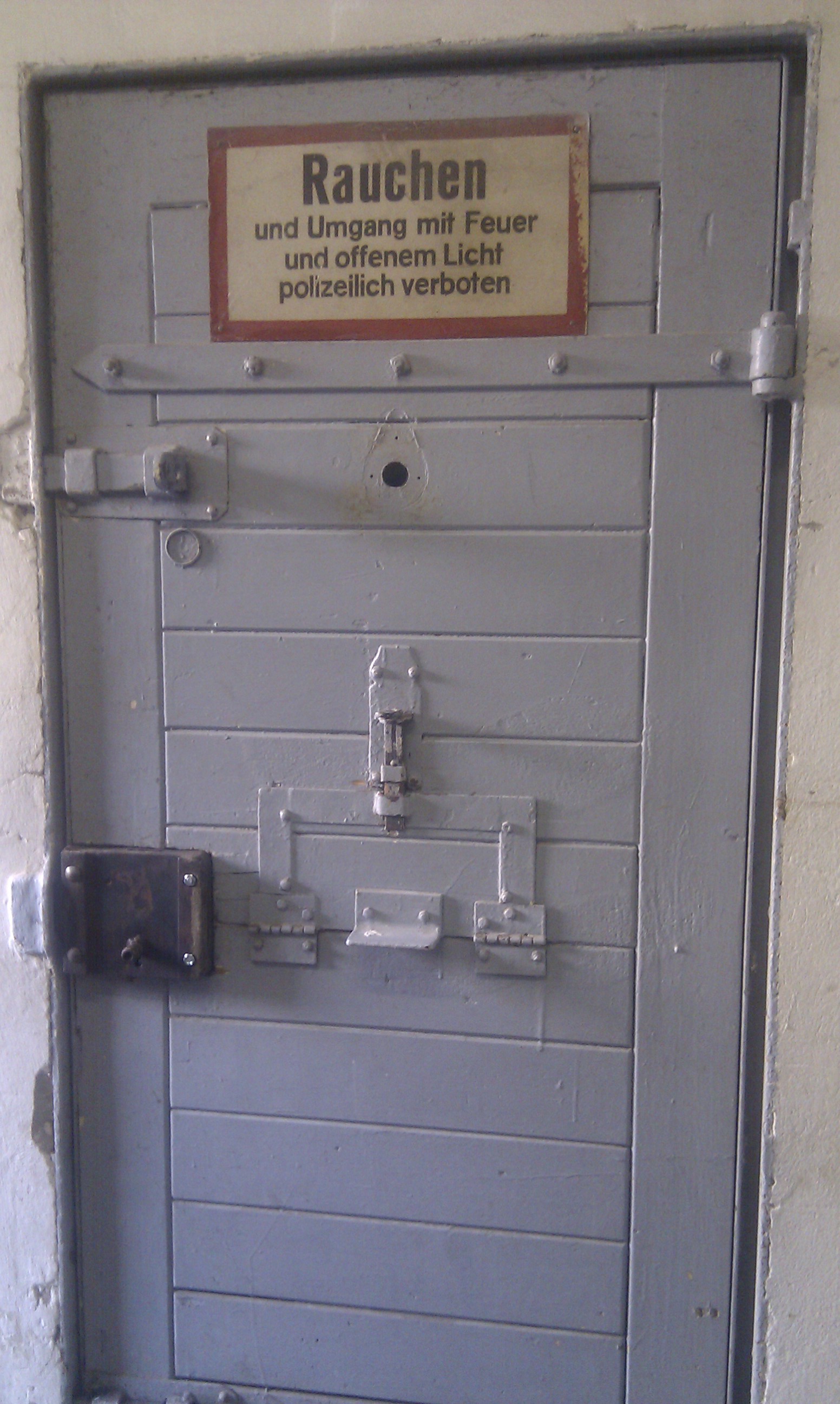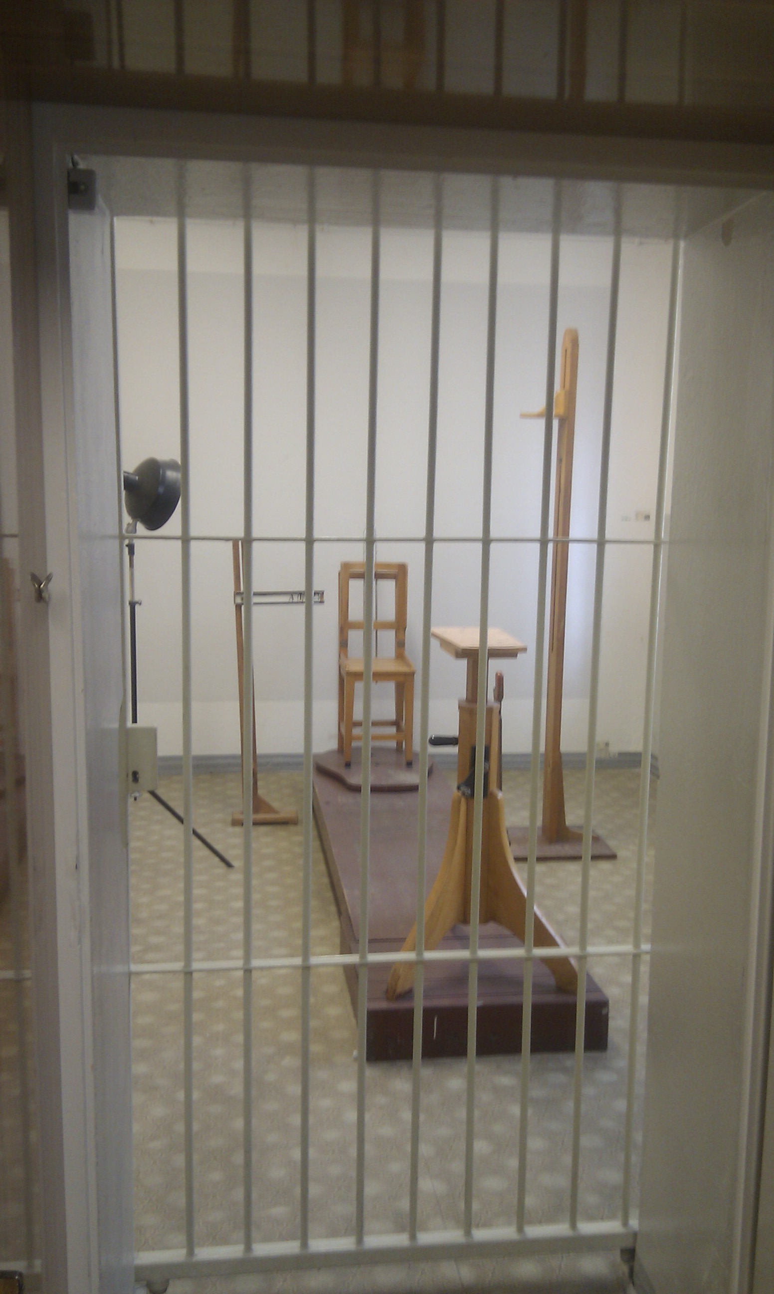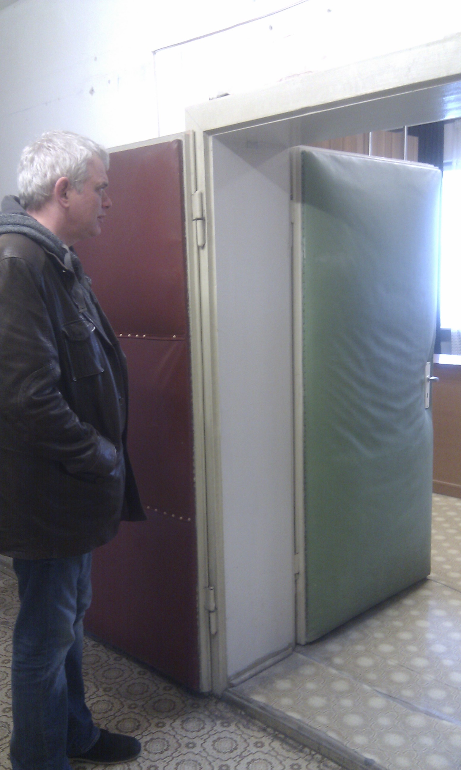 Ian surveying the padded door system featured in most of the interrogation rooms. The colours are clearly for disoriented inmates who may not know if they’re coming or going, while the double-wall insulation is probably to sound-proof whatever was going on in there: